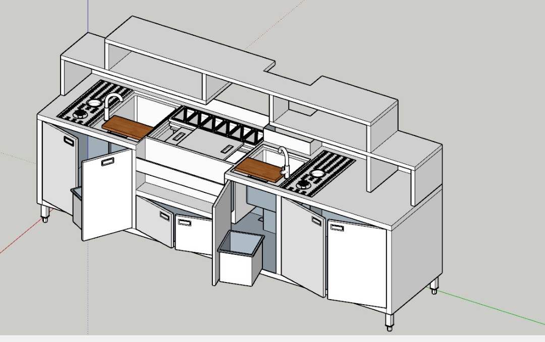 - Tích hợp bồn rửa, khay đá, kệ inox, tủ lạnh âm bàn, máy lọc nước...